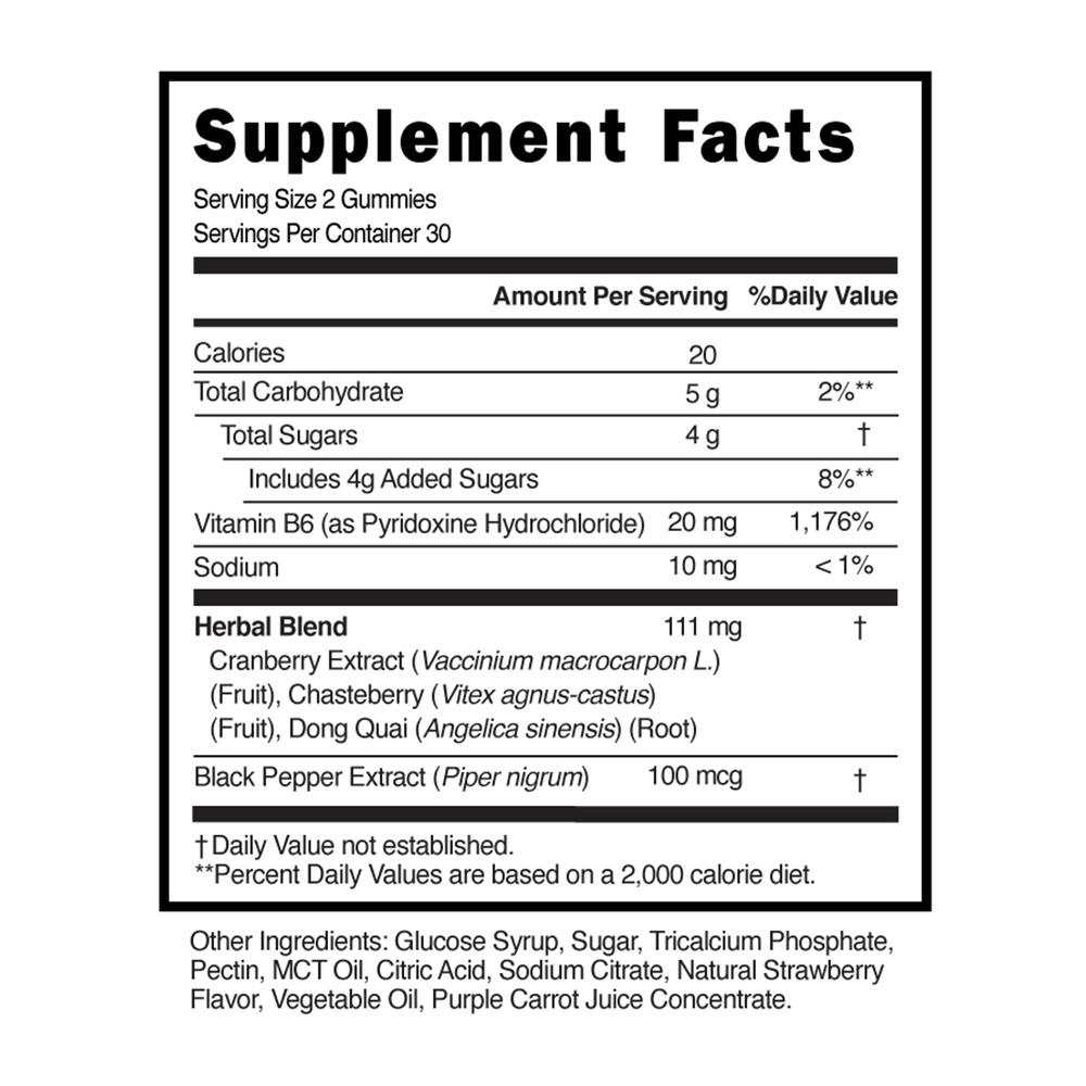 Cranberry Extract (Vaccinium macrocarpon L.)(Fruit), Chasteberry(Vitex agnus-castus)(Fruit), Dong Quai (Angelica sinensis) (Root)